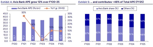 * Proprietary and new banca partners to drive growth: Proprietary channel (+22% YoY) contributed 46% of APE in Q2 and constitutes agency, direct and e-commerce. Company has recruited new 64k agents since FY22 and is now looking at productivity levers to drive higher growth from the channel. Within e-commerce, Axis Max Life has been ranked #1 in online protection and recently launched savings business and expects to maintain the position. Within banca, it has tied up with new partners- South Indian bank, Ujiivan SFB, Tamil Nadu Mercantile Bank, CSB and DCB and already has the highest counter-share in 3 out of the 6 new banks. Post re-branding, company has identified verticals within Axis Bank (Bharat banking, credit card segment, D2C) to get exclusive leads/ access to customers and has dedicated manpower (~7k employees) across Axis Bank branches. Company has 65-70% counter-share within Axis Bank and expects to maintain it at a similar level over the medium-term. While Axis Bank as a channel has grown 12% over FY20-25, it expects new banca partners/ proprietary channel to grow faster. Company has also started selling via brokers in FY23 and expects the channel to contribute to growth.