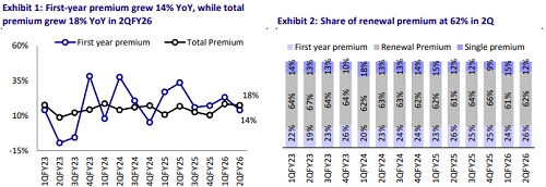* VNB margin expansion of 190bp YoY was largely driven by a product mix shift in 2QFY26, with non-par savings contribution increasing to 35% (30% in 2QFY25) and protection contribution rising to 18% (15% in 2QFY25), while ULIP contribution declined to 35% (44% in 2QFY25).