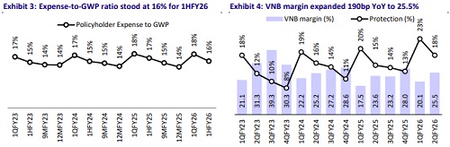 * The high-margin segments, such as protection, witnessed an APE growth of 36% YoY in 1HFY26 to INR5.4b, with rider APE rising 80% YoY. Annuity APE posted 85% YoY growth to INR3.4b in 1HFY26. Group credit life has started to recoup from 2QFY26, witnessing a growth of 24% YoY during 2Q.