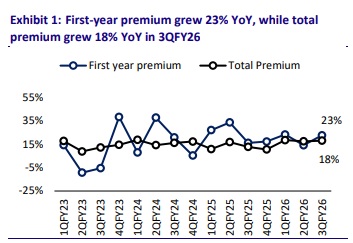 * Gross premium income grew 18% YoY to INR97b (in line). Renewal premium grew 16% YoY to INR60.5b (in line). The stable growth momentum drove market share expansion to 9.8% during 9MFY26 from 9.3% in 9MFY25.