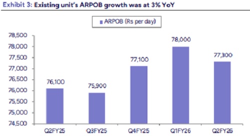 Strong quarter; EBITDA grew by 23% YoY: Base business EBITDA improved 19% YoY with margins expanding 90bps YoY to 27.5%, supported by contributions from the Lucknow Nagpur and Dwarka units, which had a low base. During Q2, the company operationalized 111 beds across Shalimar Bagh, Mohali and Dwarka. Additionally, it divested 100 beds at the Jaypee, Chitta facility. New units which now comprise of Noida contributed EBITDA of Rs 230mn vs Rs 250mn in Q1. Overall margins increased by 190bps QoQ to 26.9%. Consol occupancies decline by 400 bps YoY to 77% due to weak dengue season. ARPOB improved by ~2% YoY to Rs 77.3K. Existing units ARPOB which now includes Lucknow, Nagpur and Dwarka units came in at Rs78.7k; up 3% YoY.
