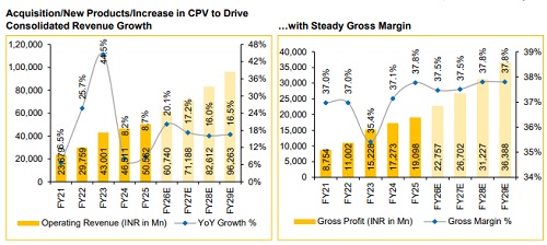 We initiate a BUY rating with a DCF-based 12-month target price of INR 650 per share (implied P/E of 29x on FY28E EPS) and currently trades at a PEG ratio of 1.5x. We forecast a ~17%/~18%/~29% revenue/EBITDA/PAT CAGR over FY26– FY29E, driven by CPV gains across three structural levers: Premiumisation (smart keys, TFT clusters, EV harnesses), new product verticals (sunroof, switches, EV products) and export scale-up (7–8% → 10–15% of revenue).