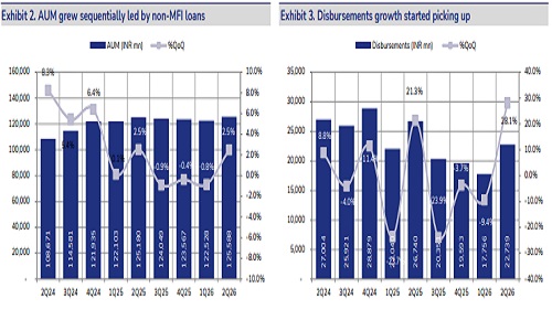 * Flattish AUM growth, diversification into new products to drive growth: Disbursements grew +28% QoQ, -15% YoY, while AUM grew +2 YoY/flat QoQ. Management remains optimistic on recovery in growth, driven by the launch of three new products: (1) micro LAP loans with ticket sizes ranging from INR 0.1-1mn, (2) gold loans through 60-40 co-lending partnership with its parent company - Muthoot Fincorp, and (3) individual loans targeting micro MSME financing. With this, management remains confident in achieving the FY26 growth guidance of 5-10%. We estimate AUM growth of +11%/+16% for FY26E/FY27E.