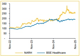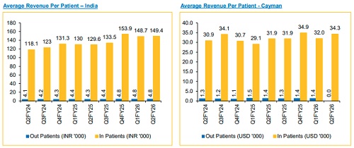 With an INR 3,000Cr expansion pipeline in India, NARH is well-positioned for sustained double-digit revenue growth. In India, initiatives, such as digitisation, patient mix optimisation and focus on high-end specialties, such as oncology and robotic surgeries will continue to drive ARPOB. The Cayman Islands business remains a strong profit engine, contributing ~25% of NARH’s consolidated revenues.