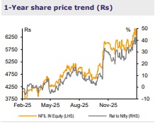 Strong order-book visibility for specialty chemicals in FY27 In specialty chemicals, NFIL continues to focus on asset utilization, backward integration, and a novel process route. The FY27 order-book visibility for specialty chemicals remains strong, with ramp-up expected in Project Nectar with increase in plant utilization from ~50% currently to ~75% next year. Its MPP debottlenecking project remains on track to be commissioned by Q3FY27; to accelerate the ramp-up, NFIL plans manufacturing the molecule already manufactured in the debottlenecking capacity. The Opteon (immersive cooling fluid) project with Chemours is expected to be commissioned by Q1FY27 – per the management, this is a >USD3bn opportunity; if it picks up pace, the management plans expanding capacity (additional capex of ~USD150mn) after two years.