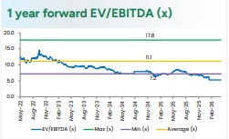 Outlook & Valuation: Nuvoco Vistas reported a healthy Q4FY26, with revenue and EBITDA supported by record quarterly volumes and a 43–44% premium trade mix. Cement volumes increased 5% YoY to 6.0 million tonnes, while the Vadraj acquisition and East India expansions are projected to scale total capacity toward 35 MTPA by FY28. This trajectory is supported by FY27-28 capex guidance of Rs.900–960 crore. Although near-term geopolitical tensions and packaging inflation present margin risks, the company is implementating fuel optimization and scaling AFR to 12–13%. Despite elevated net debt of Rs.44.4bn, operational efficiencies enabled a Rs.300 crore underlying debt reduction on a like-to-like basis. Factoring in a 7–9% industry growth outlook, the BUY rating is maintained with a target price of Rs.451.