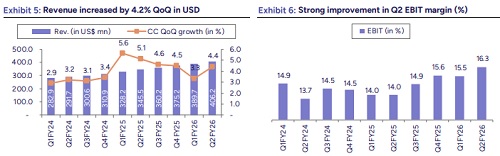 The revenue performance (+4.4% QoQ CC) exceeded our estimates (+3.7% QoQ CC), margin at 16.3% was also above our estimates of 15.8% in Q2. The growth was broad-based across verticals and geographies, BFS and H&L reported healthy growth of 7.0% and 3.8% QoQ. With sharp uptick in NN ACV (+20% QoQ) along with healthy mix of NN wins (60% of ACV) provides strong revenue visibility in the coming year. Even the deal funnel distributed broadly across verticals, including sub-segments of H&L. With healthy deal pipeline, we believe the broad momentum within verticals should continue in H2 along with broader AI theme on “AI for Tech” and “AI for Business”. On margins, it fairly exceeded our estimates by 60bps QoQ, in Q2 but we expect limited headroom for margin improvement in H2 due to compensation revision. We are revising our FY26 revenue growth to 16.8% YoY CC (15.4% earlier) that translates to ~3.1% CQGR for the rest of the year, while keeping the revenue growth for FY27E/FY28E largely unchanged. We roll forward our estimates to Sep’27 and assign 40x to arrive at a TP of INR 6,280. Retain BUY.