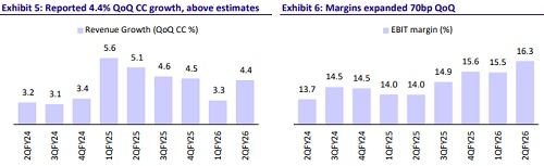 * 2QFY26 revenue stood at USD 406m, up 4.2% QoQ in USD terms (above our estimate of 3.7% QoQ). The company reported CC growth of 4.4% QoQ vs our estimate of 3.5% QoQ CC growth.