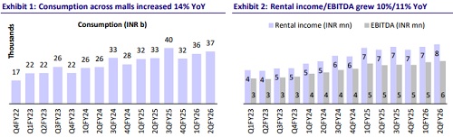 * In 2QFY26, consumption increased 13% YoY to INR37b, while it grew 12% YoY to INR73b in 1HFY26. This was led by Phoenix Palladium (Mumbai), Phoenix Citadel (Indore), Palladium Ahmedabad, Phoenix Mall of the Millennium (Pune) and Phoenix Mall of Asia (Bengaluru).