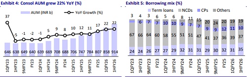 * Total AUM grew 22% YoY and 6.6% QoQ to INR914b. Wholesale 2.0 AUM grew ~43% YoY to INR113b, while Wholesale 1.0 AUM declined ~55% YoY/14% QoQ to INR54b. The company reiterated that it would look to run down its legacy wholesale book to ~INR30b by end-FY26.