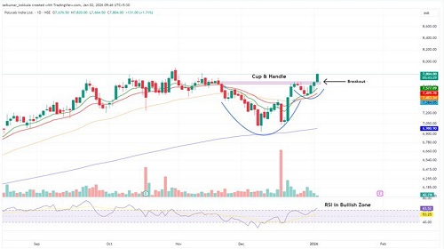 Buy Polycab India Ltd CMP 7800.00 Buy Price 7800.00 Target 8358.00 Stop loss 7450.00 Holding Periond 1 Month