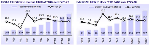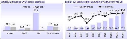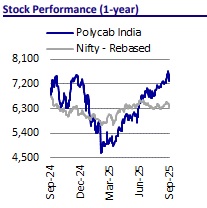 We estimate a CAGR of 18%/22%/21% in Revenue/EBITDA/EPS over FY25-28. POLYCAB has benefited from continuous capacity expansions and sustained a healthy margin (~13-15%) in the C&W segment. We project a stable margin of ~14% over FY26-28, given the company’s operational strength, an increase in contribution from the EHV capacity (expected from FY27), and export growth. Cumulative FCF is expected to stand at INR42.4b over FY26-28, despite increased capex intensity. Net cash is likely to increase to INR47.3b by FY28 vs. INR31.0b as of Jun’25. We remain structurally positive on POLYCAB, given its leadership position in the C&W segment, positive sector outlook, robust balance sheet, and strong return ratios. We reiterate our BUY rating on POLYCAB with a TP of INR8,750 (based on 40x Sep’27E EPS).