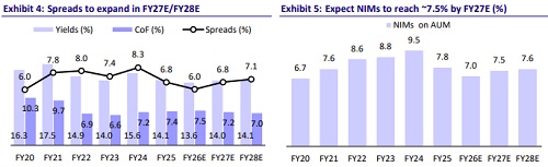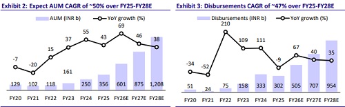 * The company is focusing on high-yield, granular products, disciplined underwriting, and strong cost controls. Management reiterated confidence in sustaining robust AUM growth momentum in FY26, supported by improving productivity and diversification benefits. We model AUM growth of 69%/46% in FY26/FY27E, leading to AUM CAGR of ~50% over FY25-FY28E.