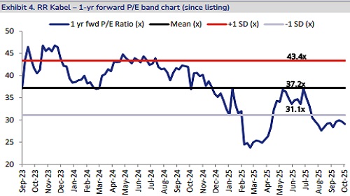 * FMEG business weak as expected; management hopeful of EBIT break even by FY26E end: RR Kabel’s FMEG segment reported a YoY decline of 3% to INR 1.9bn. This was owing to seasonal headwinds and high channel inventory, especially in fans, which is RR Kabel’s key FMEG product, while growth in the lighting vertical outperformed other categories. FMEG constituted 9% of total company revenue vs. 11% sequentially and YoY. EBIT margin in the FMEG segment stood at-6.1%, vs. -5.9% YoY. Management commentary highlighted that FMEG should break-even on an EBIT level by end-FY26E; however, on a full year basis, EBIT losses will continue, given a weaker 1H.