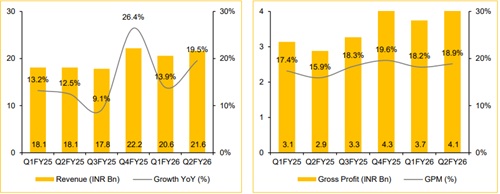 * Revenue grew by 22% YoY to INR 19.7 Bn. EBIT more than doubles to INR 1.8 Bn in Q2FY26 from INR 0.8 Bn YoY.