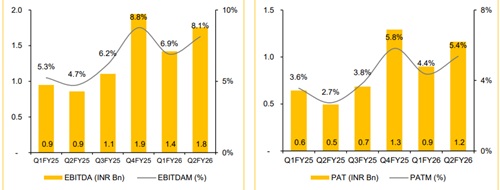 * PAT increased by ~135% YoY, coming in at INR 1.2 Bn, versus INR 0.5 Bn in Q2FY25.