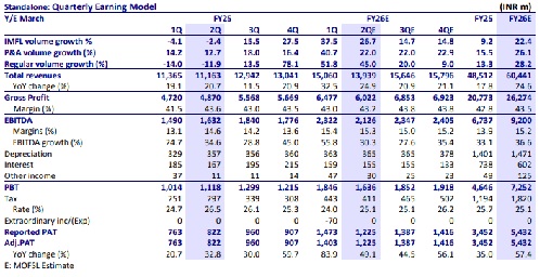 * GM to contract 40bp YoY to 43.2% on high RM prices. EBITDA margin expected to improve 60bp YoY to 15.3%.