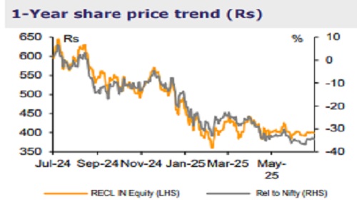 Risk-reward favorable; reiterate BUY With loan growth moderation, RECL shares have materially underperformed the broader market (RECL: -33% vs NIFTY50: +3%) in the last year on the back of loan book growth moderation. Even in a moderate growth scenario (~11-12% loan growth), the company is well-positioned to deliver ~18-19% RoE (building in normalized credit cost and some NIM compression) and ~5% dividend yield (on current prices). With these return metrics, asset quality position, and strong outlook, the risk reward is favorable with RECL shares trading at FY27E P/B of ~1x. We reiterate BUY with Jun-26E TP of Rs525.