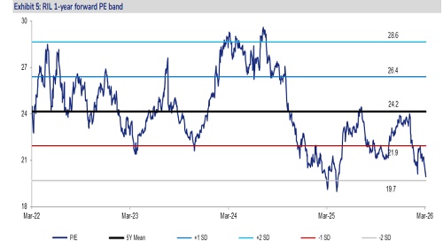 We believe the recent correction in RIL’s share price is overdone (4% this week and 8% in the last 1 month after rise in Middle East tensions) as it won’t be negatively impacted by the recent spike in crude and LNG prices. Instead, RIL could see near-term benefits due to: a) jump in diesel crack on account of supply disruption risk; and b) likely rise in petchem margin (as petchem product prices are likely to rise along with crude price while its feedstock cost is unlikely to rise much as it has limited dependency on crude-linked naphtha). The correction in RIL seems largely due to FII-related selling (FII holding at 21.1% at end-Dec’25 versus peak of 28.3% at end-Mar’21). At CMP, RIL is trading near our bear-case valuation of ~INR 1,275/share - exhibit 3. We reiterate BUY (unchanged TP of INR 1,730) on comfortable valuations after the recent correction, as share price adequately factors concern around near-term weakness in retail business EBITDA growth on account of ramp-up in the quick commerce business. However, it’s not discounting 15-16% EBITDA-compounding story in Digital business over the next 2-3 years driven by 10-11% ARPU CAGR; hence we expect 14-16% EPS CAGR for RIL over the next 3-5 years. Key triggers are Jio’s IPO in the next few months (assuming SEBI norms for large IPOs are notified in the next few weeks) and likely telecom tariff hike post that. At CMP, the stock is trading at FY28E P/E of 16.8x (3-year average 23.9x) and FY28E EV/EBITDA of 8.2x (3-year average 11.9x).