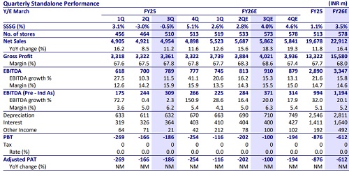 * We model 40 store additions in India, taking the store count to 573 (12% YoY). We expect 80bp improvement in GP margin to 68.6% on stable RM prices and EBITDA Margin to be contracted 40bp YoY to 15.5% on account of some operating deleverage.