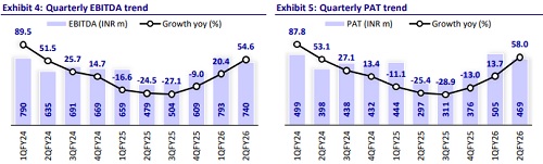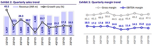 In 2Q, gross margin improved 322bp to 47.1% YoY and 129bp QoQ due to 1) lower discounting in the fast-growing e-com & MT channel, 2) RM prices softening, and 3) value engineering. EBITDA grew by 54.6% to INR740m, settling EBITDA margin at 13.9% (+342bp YoY), while EBIT grew by 70.0% to INR565m despite higher depreciation (+19.6%). PAT grew by 58.0% to INR469m despite lower other income (-18.4%) and lower interest cost (-13.2%). With better revenues in 2HFY26, we expect further margin improvement.