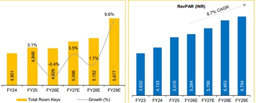 SAMHI, by FY29E, is expected to operate 5,677 keys across its key micromarkets, strategically located around corporate corridors and major air-traffic hubs. Its acquisition-and-rebranding strategy, accounting for nearly 87% of its portfolio, has been the centre of this growth engine, enabling the turnaround of underperforming assets under global brands, while the remaining 13% adds steady performance support. With planned expansions, rebranding, and conversions to upper-upscale inventories, we expect ARR growth CAGR of 7.7% and a revenue CAGR of 14.3% over FY26E–29E, reaffirming SAMHI’s position as a high-efficiency consolidator in India’s premium hospitality market.