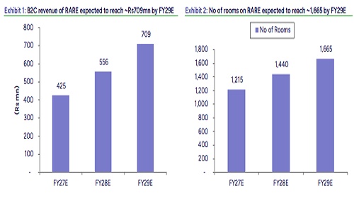 RARE currently gets a B2B listing fee of Rs0.2-0.4mn per hotel per year. However, as the platform integrates with Marriott’s ecosystem and the B2C stack is ready, RARE will be able to attract direct bookings. We expect B2C revenue of Rs425mn/Rs556mn in FY27E/FY28E led by increase in occupancy and ARR of the existing hotels listed on the platform as well as addition of new listings arising from strong parentage of Marriott.