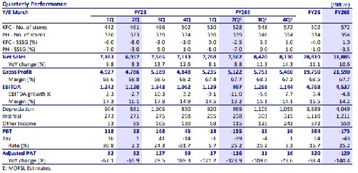* KFC revenue is expected to grow 9% YoY, led by store additions (15% YoY). We model 18 store addition and a 2.5% YoY fall in same-store sales; however, same-store transaction growth will be positive, led by value portfolio.