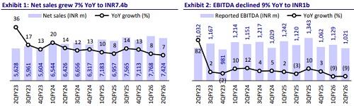* Sapphire Foods India (SAPPHIRE) reported revenue growth of 7% YoY (in line) in 2QFY26, backed by a 10% YoY increase in store count. KFC sales grew 7% YoY and same-store sales declined 3% (in line). Excluding Navratri, sales grew 10% YoY with flat SSSG. Pizza Hut (PH) revenue declined 6% YoY as same-store sales declined 8% (est. -7%). PH in Tamil Nadu grew in double digits, backed by mass media advertising. PH saw 5% store additions. Sri Lanka posted healthy revenue growth of 23% YoY (+18% in LKR), driven by 14% LKR SSSG and 7% store growth.
