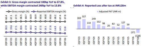 * Gross margin contracted 100bp YoY (up 40bp QoQ) to 67.8% (in line). KFC ROM was down 270bp YoY at 13.8% (est. 13%), impacted by lower ADS (down 7% YoY to INR103k), operating deleverage, lower gross margin and higher delivery mix. PH ROM contracted 590bp YoY to -1.8%. However, excluding additional marketing investments, PH ROM was at a breakeven level. Sri Lanka ROM declined 10bp YoY to 15.4%. Consolidated restaurant EBITDA pre-Ind-AS fell 13% YoY to INR841m (beat) and margins declined 250bp YoY to 11.3% (12.1% in 1QFY26). PreInd-AS EBITDA fell 7% YoY to INR548m and margins contracted 110bp to 7.4% (7.1% in 1QFY26).