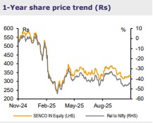 Senco delivered a muted revenue growth of ~2.4% in Q2, likely impacted by the unprecedented rains in its core eastern market, gold spikes, and a high base. However, Senco has more than recouped the sales it lost in Q2, with 56% growth in Oct-25. Senco added 5 new jewelry stores in Q2FY26 (3 franchisee, 1 company-owned, and 1 international), taking the total store-count to 184 (excl Sennes stores). Further, the management retained its guidance of opening 20 stores in FY26, with a higher tilt toward the franchisee model (vs previous outlook of 50-50 expansion). On profitability, EBITDA margin stood at 6.9% in Q2 vs 3.5% last year, aided by gross margin expansion of ~600bps to 17%, likely increase in making charges, better studded mix, and relatively lower hedging mix in Q2. With a strong margin performance in H1 and ~25% topline growth in 7MFY26, Senco’s outlook of delivering 18-20% topline growth, 6.8-7.2% EBITDA margin, and 3.5-3.7% PAT margin in FY26 is not demanding. Our estimates bake in the top-end of the topline outlook and the mid-point of the margin outlook.
