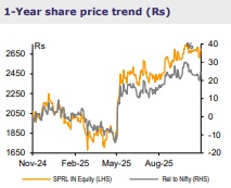 SPRL reported an in-line Q2, with consolidated revenue/EBITDA up 16%/16.5% YoY to Rs10.2bn/Rs2.1bn, respectively, and a robust 20.4% EBITDAM, outpacing auto industry’s production growth of 10% YoY (PVs+2Ws+CVs) despite some impact on the mix due to GST cut-led transition. The standalone performance was also healthy, with 10% YoY revenue/EBITDA growth and 20% EBITDAM. Subsidiaries (C-S) accounted for 14% of consolidated revenue (9%/13% in Q2FY25/Q1FY26), with 17% EBITDAM (13.5/15% in Q2FY25/Q1FY26). SPRL is rapidly scaling through major businesses won across legacy and emerging (EV) products over the past 2 quarters; the management reiterated its confidence in sustaining industry-beating growth, led by a diversified portfolio across powertrains and a higher focus on emerging ICE tech (including alternative fuels), exports (global piston capacities are being vacated on EV fears, creating supply gaps for SPRL to fill), non-auto (marine, industrial, snow mobiles, lawn mowers, etc), and aftermarket (some impact in Q2 on GST cut-led transition). We continue to prefer SPRL within auto ancillaries, given its dominant positioning in core segments, even as it is strategically diversifying into emerging/non-ICE parts. We increase our FY27E/28E EPS by 3-5% and retain BUY, while raising our TP by 11.5% to Rs3,400, at 20x Sep-27E PER (rolled forward). SPRL trades at 15x Sep-27E PER.