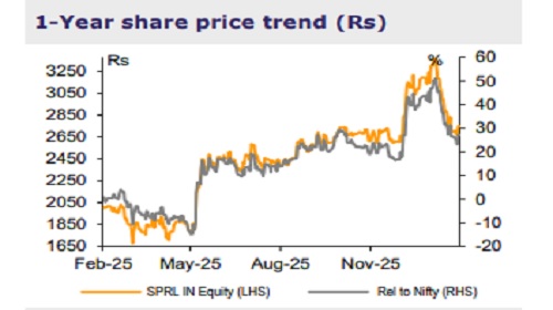 SPRL reported a largely in-line Q3, with consolidated revenue/EBITDA growth accelerating to ~20.7/20.6% YoY, coming in at Rs10.2bn/Rs2.1bn. EBITDAM was robust at 20.1%, outpacing the auto industry’s production growth of 16.3% YoY (PVs+2Ws+CVs) despite some impact from an unfavorable vehicle mix due to GST cutled transition. Standalone performance was also healthy, with 12.4%/9.5% YoY revenue/EBITDA growth and 20.6% EBITDAM. Subsidiaries (C-S) contributed to 15.5% of consol revenue (9.2/14.1% in Q3FY25/Q2FY26), with 17.3% EBITDAM contribution (9.8/16.9% in Q3FY25/Q2FY26). SPRL is seen rapidly scaling up via major businesses won across legacy and emerging products (EV, precision plastic injection molding) over the past 3 quarters; the management reiterated its confidence on sustaining industry-beating growth, led by a diversified portfolio across powertrains and higher focus on emerging ICE tech (including alternative fuels), exports (global piston capacities are being vacated on EV fears, creating supply gaps for SPRL to fill), non-auto (marine, industrial, snow mobiles, lawn mowers, etc), and aftermarket. We continue to favor SPRL within auto ancillaries, given its dominant positioning in core segments, even as it is transitioning into a multi-product player by diversifying into emerging/non-ICE parts (35% of revenue by FY27 vs nil/15% in FY23/25), via strategic acquisitions. We maintain BUY, with unchanged TP of Rs4,650, at 25x Dec27E PER. SPRL trades at 15x Dec-27E PER.