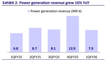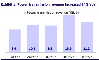 The power transmission and generation segments reported revenue broadly in line with our estimates in 1QFY26. Power transmission revenue increased 34% YoY to INR11b, EBIT rose 61% YoY to INR3b, and EBIT margin expanded 410bp YoY to 24.3%. Power generation revenue rose 16% YoY to INR8b, EBIT grew 7% YoY to INR2b, and EBIT margin at 19.7% contracted 170bp YoY but improved by 410bp QoQ. We expect the power transmission segment to continue to benefit from strong demand and ongoing capacity expansion plan. The power generation segment has grown well vs. single-digit-growth guidance given by the company earlier. We expect power generation segment to benefit from improving demand for both steam and gas turbines.