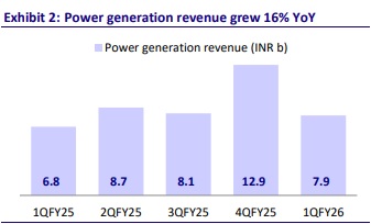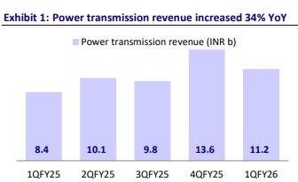 The power transmission and generation segments reported revenue broadly in line with our estimates in 1QFY26. Power transmission revenue increased 34% YoY to INR11b, EBIT rose 61% YoY to INR3b, and EBIT margin expanded 410bp YoY to 24.3%. Power generation revenue rose 16% YoY to INR8b, EBIT grew 7% YoY to INR2b, and EBIT margin at 19.7% contracted 170bp YoY but improved by 410bp QoQ. We expect the power transmission segment to continue to benefit from strong demand and ongoing capacity expansion plan. The power generation segment has grown well vs. single-digit-growth guidance given by the company earlier. We expect power generation segment to benefit from improving demand for both steam and gas turbines.