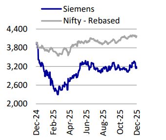The company’s strong order inflows in 12MFY25 provide good visibility for revenue growth. We believe that going forward, growth will be driven more by the smart infrastructure segment and mobility, while the digital industries segment will remain impacted by weak private capex growth. We expect margin improvement in smart infrastructure and mobility as localization and operating leverage benefits play out. Uncertainties exist about the timing of ordering from railways as well as from private capex.
