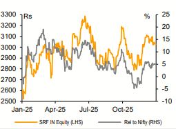 SRF’s Q3 EBITDA at Rs7.8bn (+26% YoY/Flat QoQ) was in line with our estimate of Rs7.8bn and below consensus estimate of Rs8.2bn. Better margin performance YoY in chemicals business was led by higher volume and realization of refrigerants in domestic and exports markets, offset by subdued performance in the spec chem business due to deferred customer offtake and continued pricing pressure from Chinese competitors. Performance films reported stable performance, while Technical Textiles continues to be impacted. The management remains cautiously optimistic and expects lower growth in the spec chem business, while refrigerants continue to do well in global markets. SRF will incur all new capex, including HFOs, at its new land parcel in Odissa. We cut our FY26/FY27/FY28E EBITDA by 5-6% to factor in near-to-medium term headwinds in the spec chem business. Retain ADD and TP of Rs3,250.