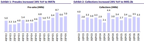 * SRIN reported pre-sales of INR7b in 2QFY26, up 34% YoY/7% QoQ (19% above estimate). In 1HFY26, presales were INR13.6b, up 32% YoY. ? Collections were up 24% YoY at INR3.3b for 2QFY26 (28% below estimate). In 1HFY26, collections stood at INR6.8b, up 12% YoY.