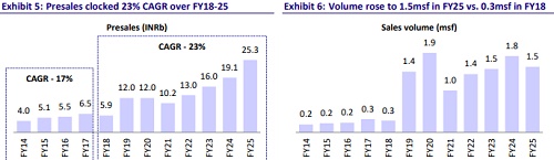 * In 2QFY26, the company entered into a joint development agreement to develop a project located at Mira Road along the Western Express Highway. The project offers a development potential of 0.55msf on a land parcel measuring around 3.5 acres, with an estimated GDV of INR12b. Overall, in 1HFY26, the company added two projects with GDV of INR23b and developable area of 0.83msf.