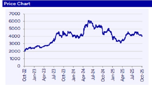 Supreme Industries’ (SI) Q2FY26 volume growth was 11.8% above our estimates of 6.8%. SI expects H2FY26 to better than H1FY26, supported by the likely imposition of ADD on PVC resin, improved agriculture demand, and higher government spending. EBITDA margin in Q2FY26 contracted by 160bps YoY to 12.4%, primarily due to higher other expenses arising from the acquisition and consolidation of the Wavin business. The management has revised its FY26 guidance for overall volume growth of 14–15% to 12-14%, while maintaining its P&F volume growth of 15–17% and EBITDA margin guidance at 14.5–15%. In FY26 SI expects its plastic pipe segment capacity to reach 1mn MT. We estimate FY25-28E revenue/EBITDA/PAT CAGR of 14.6%/18.2%/19.6%, with volume CAGR of 13.0% and EBITDA margin expansion of ~130bps. We have revised our earnings estimates for FY27/FY28E by 0.9%/0.6% and maintain TP to Rs4,723 (earlier Rs 4,758) based on 40x Sep’27E earnings. We are upgrading our rating from ‘Accumulate’ to ‘BUY’’, due to recent correction in stock prices.