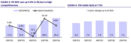 * Swiggy delivered a revenue of INR55.6b in 2QFY26 (up 12.1% QoQ) vs. our estimate of INR54.6b. The food delivery (FD) business’s GOV grew 18.7% YoY, whereas the contribution margin (CM) remained stable at 7.3%. FD’s adj. EBITDA as a % of GOV margin improved 40bp QoQ to 2.8% vs. our est. of 2.7%.