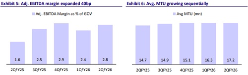* FD growth in line, but QoQ growth indicates some market share loss: Swiggy's GOV grew by 5.6% QoQ, a tad slower than Eternal, indicating some market share loss. The company has managed to increase marketing expenses in response to Eternal as both players fight in a slowing FD market. Adj. EBITDA margin, however, improved sequentially, and we expect linear improvement (5% of GOV in the next three years).