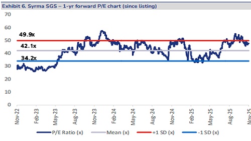 * Progress in PCB business on track; Central government approvals in place: Syrma’s proposed PCB business has a total capex layout of around INR 15bn-16bn spread across 2 phases. Phase 1 capex for multi-layer PCB is expected at ~INR 8bn with asset turn of 1-1.2x, and EBITDA margin of 12-15%. Syrma SGS has already received approval under the Component Manufacturing Scheme of the Indian Government for multi-layer PCB (Phase 1) and approvals for CCL and HDI PCB (Phase 2) are expected soon. Further, we note that progress in Phase 1 is on track with initial expectations, with commencement expected from Dec’26/4QFY27. End-use industries here will include consumer, automotive, industrial and healthcare.