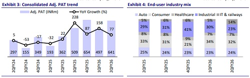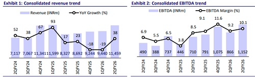 * Syrma SGS Technology (SYRMA) continued its strong operating performance, with EBITDA up ~62% YoY in 2QFY26. EBITDA margin expanded 150bp YoY due to a favorable business mix and better operating leverage. Revenue grew 38%, largely led by a strong jump in IT/Railways revenue (up 4x), followed by the Consumer/Auto businesses, which grew 35%/28% YoY.