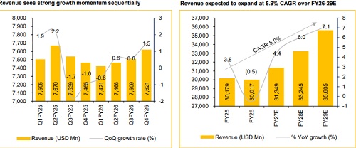 * TCS reported Q4FY26 revenue of USD 7.6 Bn, up 1.5% QoQ (vs CIE est. 0.7%), with CC growth of 1.2% QoQ. In INR terms, revenue stood at INR 706.9 Bn, rising 5.4% QoQ (vs CIE est. 3.0%). For FY26, revenue came in at USD 30.0 Bn, down 0.5% YoY (vs CIE est. -0.7%), while CC revenue declined 2.4% YoY. In INR terms, FY26 revenue stood at INR 2,670.2 Bn, up 4.6% YoY (vs CIE est. 4.0%).