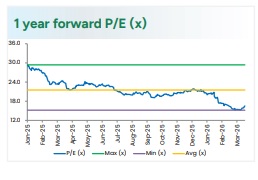 Outlook & Valuation Perspective: Tata Consultancy Services management remains optimistic for FY27, supported by a strong deal pipeline, rising AI adoption, and sustained client investments in technology. While geopolitical and macro uncertainties persist, AI-led services are expected to be net accretive to growth over time. The company continues to command a premium valuation, backed by strong margins, consistent cash flows, and leadership in digital transformation. Its transition toward an AI-driven, platform-led model enhances long-term earnings visibility. We estimate Revenue/EBIT/PAT CAGR of 5.6%/3.5%/3.2% over FY26-28E and maintain a BUY rating with a target price of ?3,255