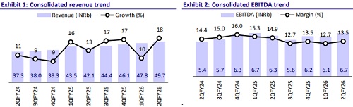 * In 1HFY26, revenue/adj PAT grew 14%/7% YoY to INR97.4b/INR7.4b, while EBITDA declined by 1% to INR12.8b. ? Gross debt stood at INR5.8b as of Sep’25 vs. INR5.4b as of Mar’25. Further, CFO stood at ~INR2b as of Sep’25 vs. INR2.9b as of Sept’24.