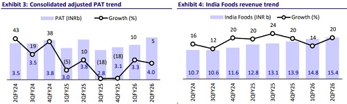 * Consolidated revenue in 2Q grew 18% YoY to ~INR50b (est. INR48b). EBITDA margin contracted 130bp YoY to 13.5% (est. 13.2%) due to volatility in coffee prices and tariffs, leading to pressure on the international market. EBITDA grew 7% YoY to INR6.7b (est. INR6.3b). Adj. PAT grew 5% YoY to INR4b (est. INR3.7b).