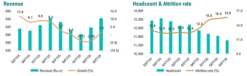 • Headcount stood at 11,594, down 2.9% QoQ and 9.9% YoY, with attrition at 15.6% (+320 bps YoY). Management remains cautious on hiring, with utilization at ~75% and potential to reach 80–85% via automation, AI, and GenAI. Hiring will be selective, focusing on niche skills, as near-term growth is expected from productivity gains rather than headcount expansion.