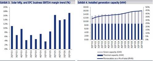* Solar cell/ module manufacturing: The 4.3GW cell and module manufacturing plant has produced modules of 970 MW in 2QFY26 vs. 879 MW in 2QFY25. Cell production stood at 928MW vs. 904MW in 1QFY26. The manufacturing unit reported Revenue/ EBITDA/ PAT of INR 17bn/ INR 5bn/ INR 2bn in 2QFY26 vs. INR 14bn/ INR 1bn/ INR 660mn in 2QFY25. Interest cost and depreciation for the facility has increased by 3x YoY and 6x YoY due to higher borrowings and capitalisation of assets. It is also evaluating plans to setup 10GW ingot and wafer manufacturing facility.